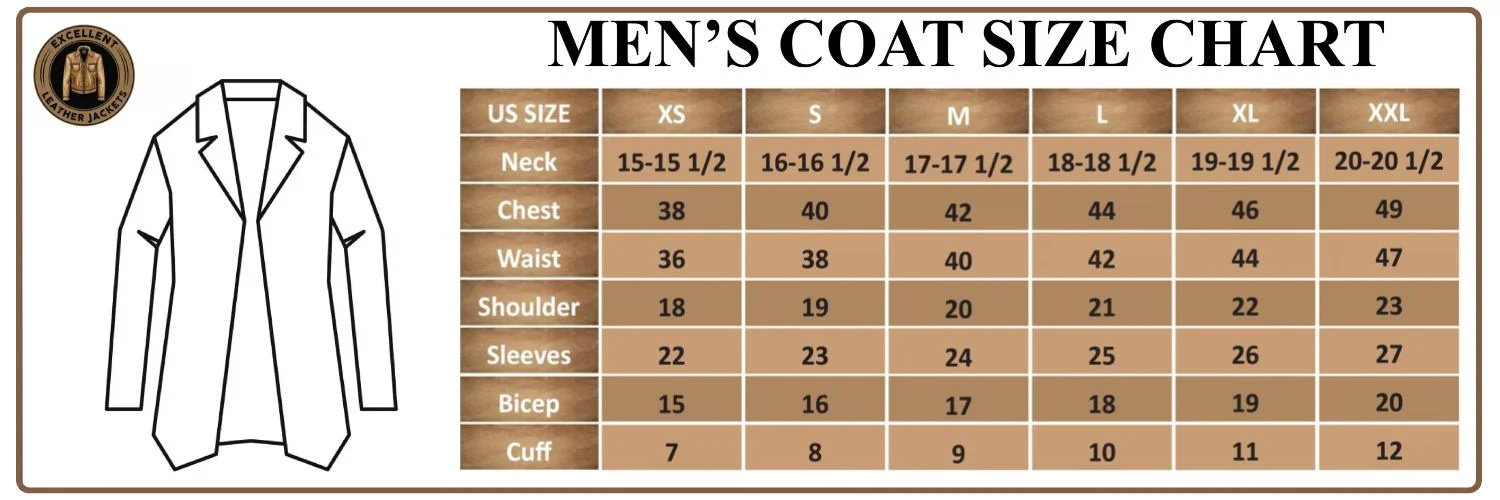 Leather doesn’t stretch fit it right the first time. Shoulders should sit clean with no overhang. Length runs from mid-thigh for everyday wear to full-length for a stronger silhouette. Leave room to layer underneath. Sleeves end at the wrist. Every measurement matters more here than with any other outerwear. View our men’s leather coat size guide to find your fit.